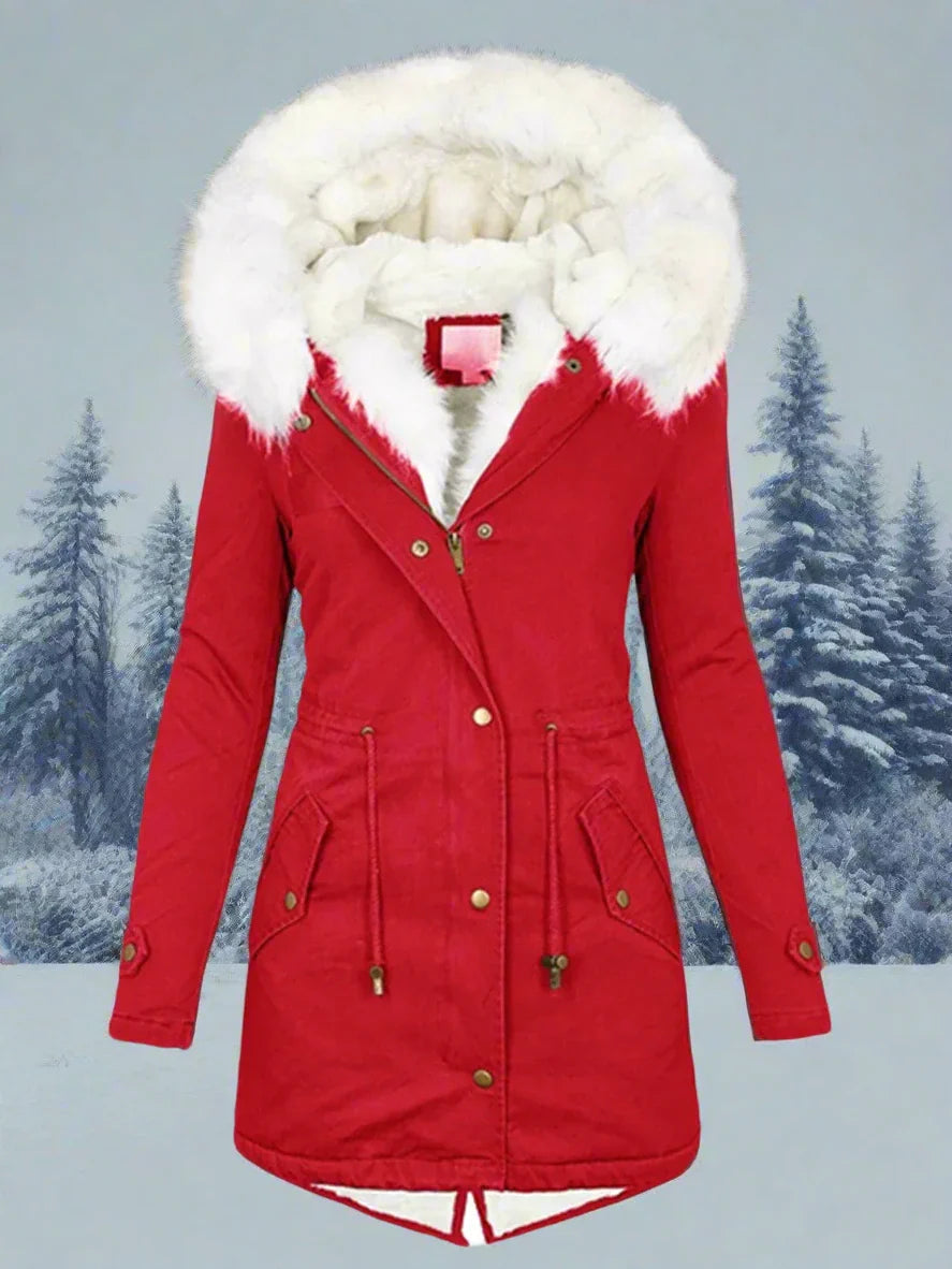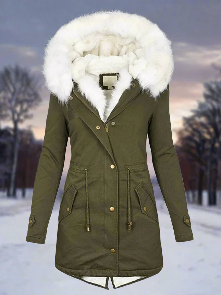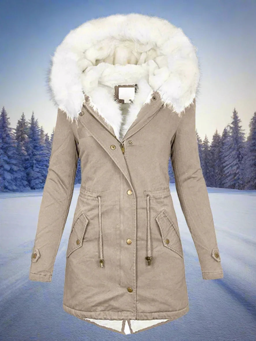 Stylowa damska parka zimowa, idealna na mroźne dni. Kurtka posiada miękkie futrzane ocieplenie oraz obszerny kaptur wykończony gęstym futrem, co zapewnia doskonałą izolację cieplną i elegancki wygląd. Regulowane sznurki w talii pozwalają na idealne dopasowanie, a praktyczne kieszenie dodają funkcjonalności. Zapięcie na zamek i napy zapewnia dodatkową ochronę przed zimnem. Świetny wybór do codziennych zimowych stylizacji.