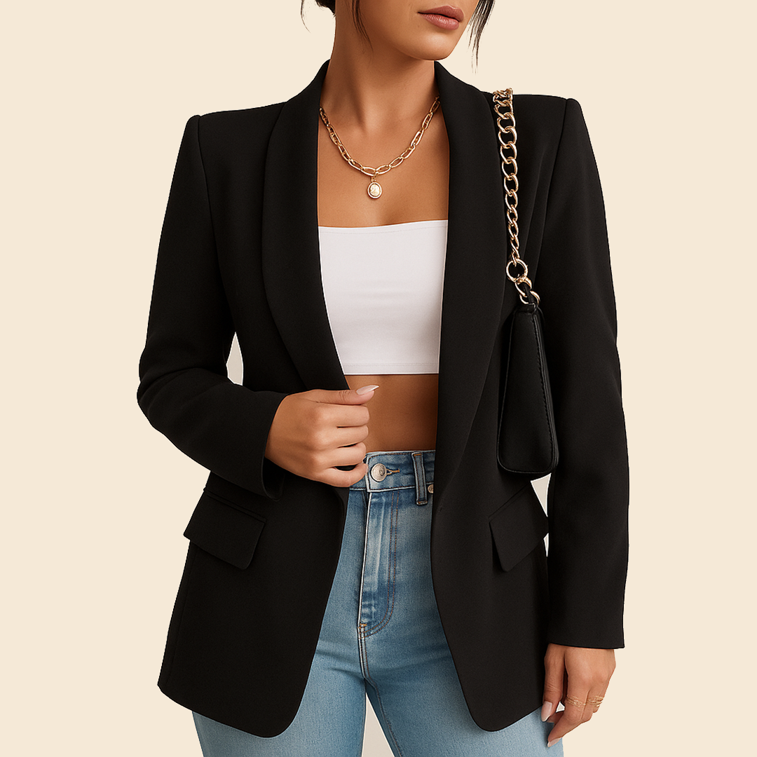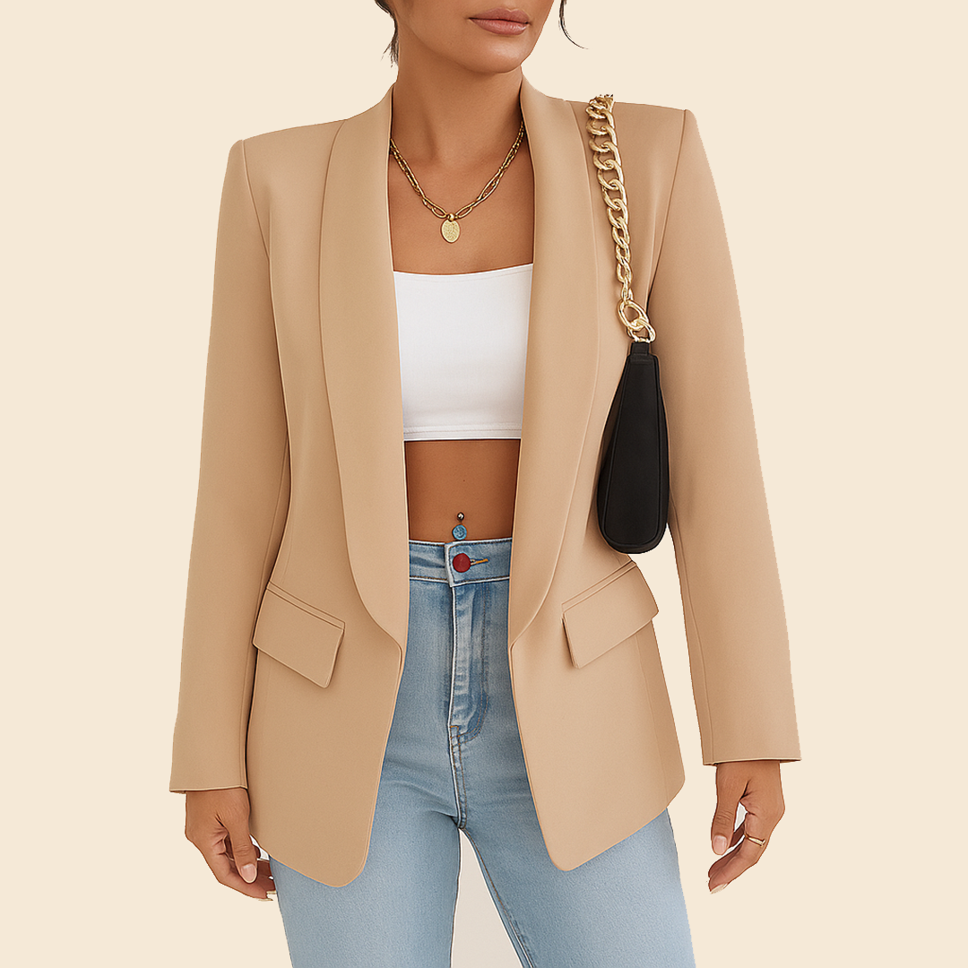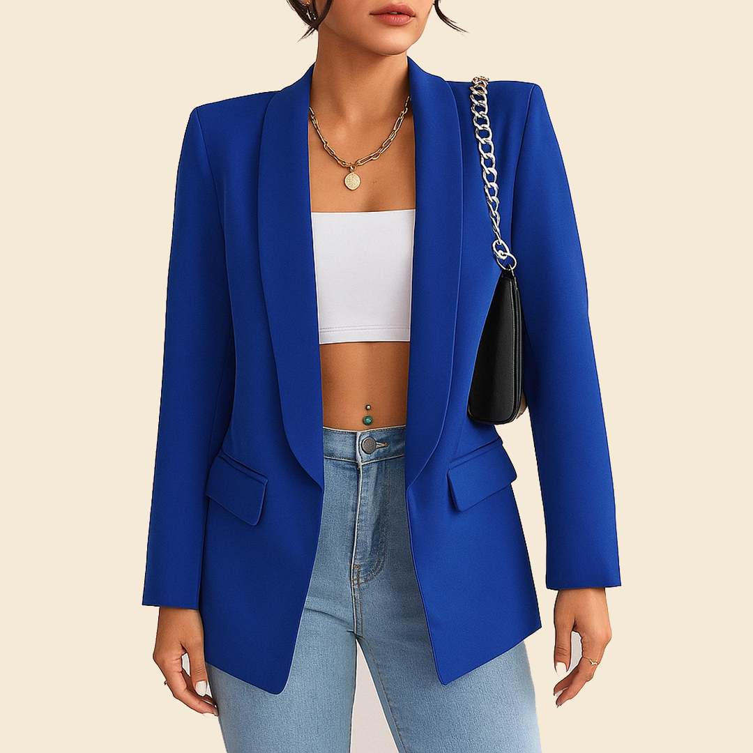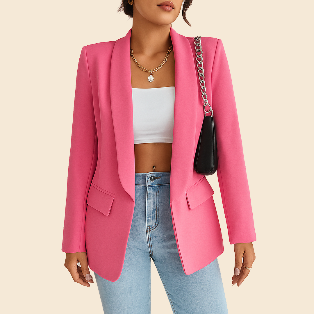 Damski Żakiet Z Długim Rękawem | Formalny to model o prostym kroju wykonany z tkaniny o jednolitej strukturze i gładkim wykończeniu. Żakiet posiada kołnierz z klapami, długie rękawy oraz zapięcie na guziki umieszczone w centralnej części przodu. Na przedniej części znajdują się kieszenie z prostym obszyciem. Model można zestawić z koszulami, spodniami materiałowymi lub spódnicami, tworząc zestawienia o neutralnym, formalnym charakterze.