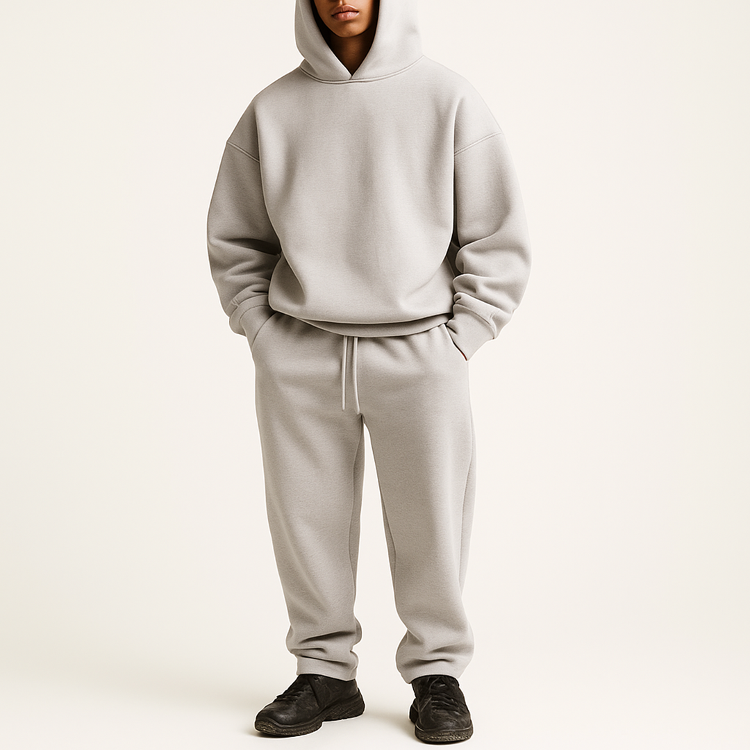 Everyday Oversize Two-Piece Set | With Hoodie is a set consisting of a loose-fitting hoodie and straight-leg pants. Both pieces are made from fabric with a uniform texture and smooth finish. The hoodie features long sleeves and a ribbed hem at the bottom edge, while the pants are equipped with an elastic waistband and side pockets. The model creates a cohesive look suitable for everyday use and urban-style outfits.