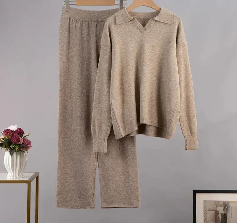 Damski komplet dzianinowy z szerokimi spodniami i luźnym swetrem