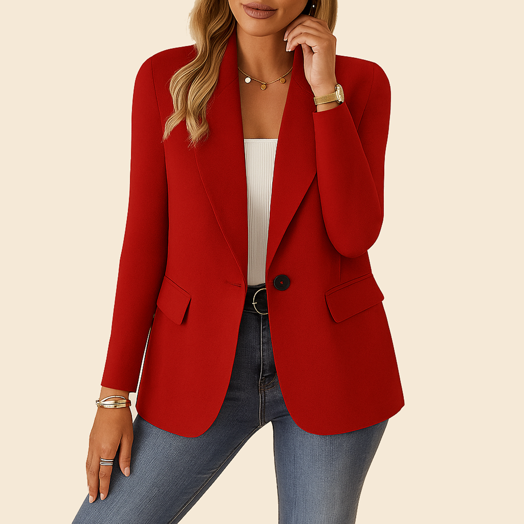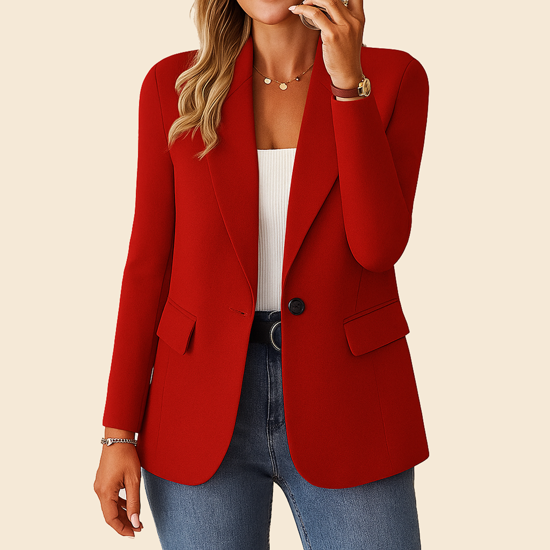 Casualowy Damski Żakiet Z Kołnierzem | Czerwony to model o prostym kroju wykonany z tkaniny o gładkiej strukturze i jednolitym wykończeniu. Żakiet posiada klasyczny kołnierz z klapami, długie rękawy oraz zapięcie na guziki umieszczone w centralnej części przodu. Na przedniej części znajdują się kieszenie z prostym obszyciem. Czerwony kolor nadaje całości wyrazisty wygląd, a fason można łączyć z koszulami, spodniami lub spódnicami w codziennych stylizacjach.