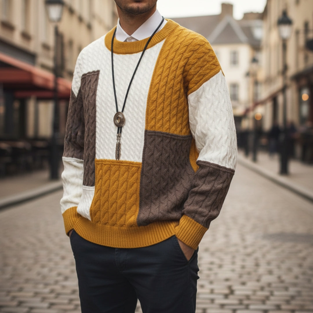 Sweter w stylu europejskim casual posiada okrągły dekolt i luźny krój, który pasuje do każdej sylwetki. Sploty warkoczowe na kolorowych panelach dodają bogatej tekstury i rzemieślniczego charakteru. Idealny do zestawienia z jeansami na co dzień lub z chinosami na wieczorne wyjście – ten model to uniwersalny i modny dodatek do garderoby każdego mężczyzny.
