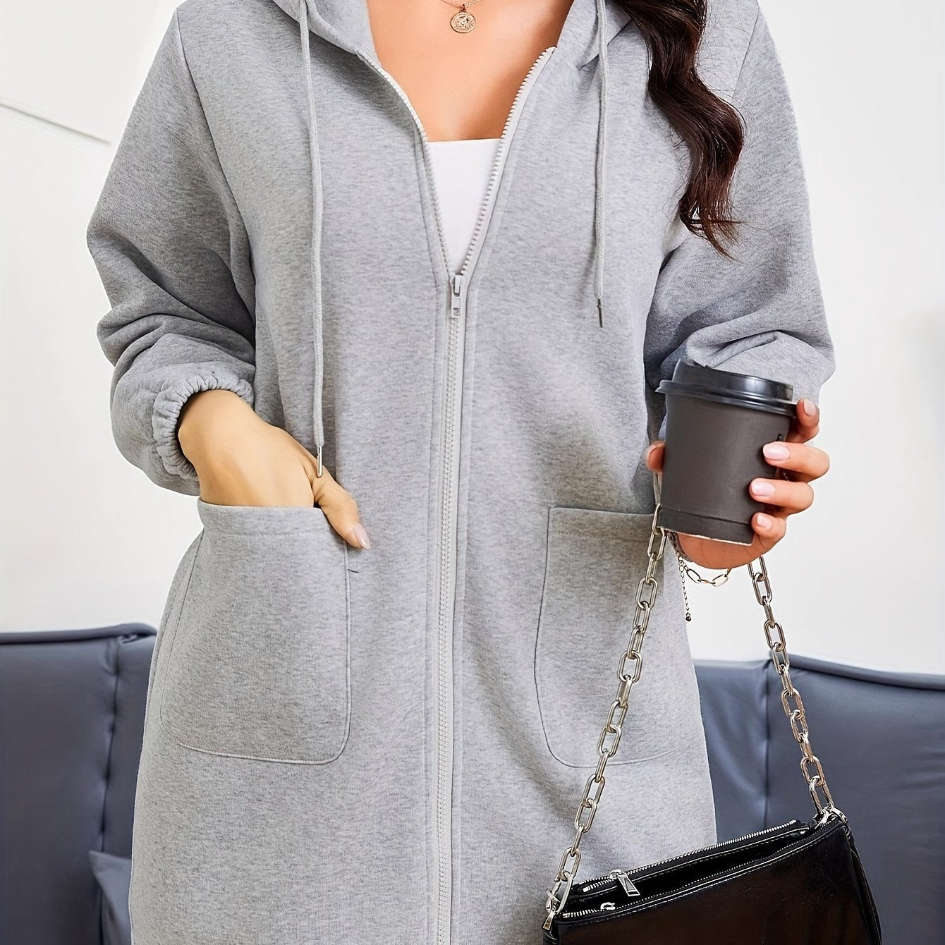 Ciesz się komfortem i swobodą z tą damską dłuższą bluzą z kapturem na zamek, idealną na chłodniejsze dni. Bluza została zaprojektowana z myślą o wygodzie, oferując luźny krój, który świetnie sprawdzi się na co dzień. Wykonana z miękkiego, przyjemnego w dotyku materiału, zapewnia ciepło i komfort noszenia. Kaptur z regulowanym sznurkiem oraz elastyczne mankiety dodają funkcjonalności, a pojemne kieszenie z przodu pozwalają na przechowywanie drobnych przedmiotów lub ogrzanie rąk.