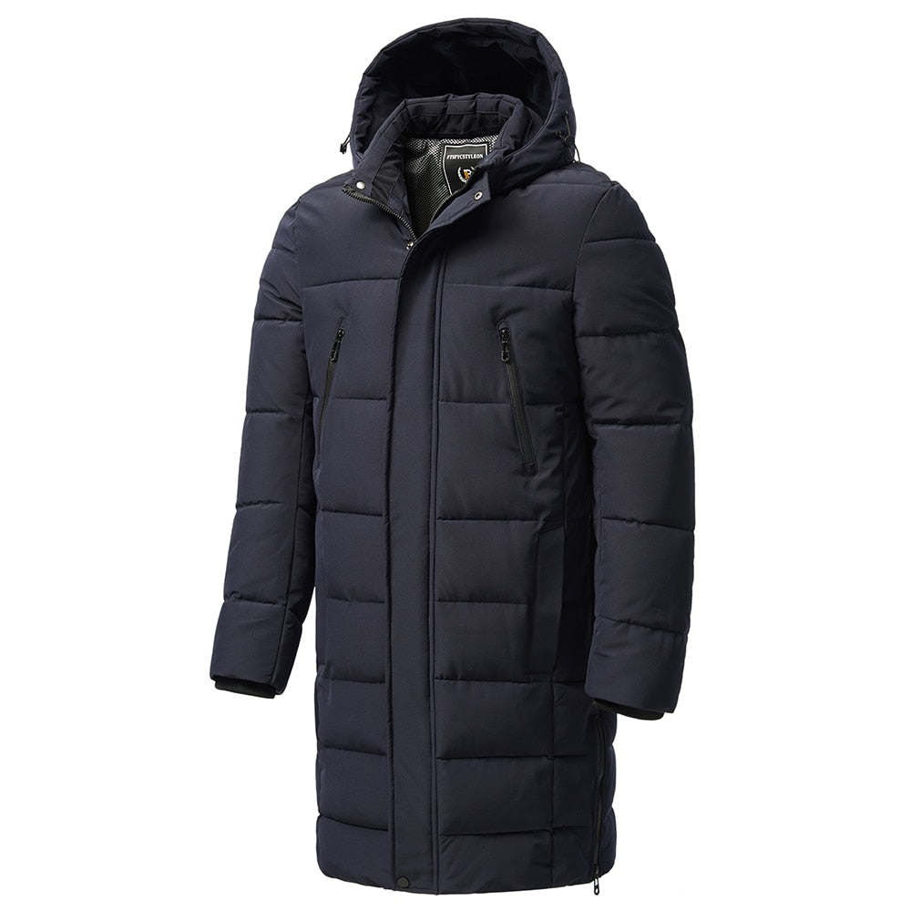Elegancka męska długa kurtka puchowa z kapturem, stworzona z myślą o zimowych warunkach. Wyposażona w wysokiej jakości wypełnienie, które zapewnia doskonałą izolację cieplną, jednocześnie pozostając lekka i wygodna. Kurtka posiada praktyczny kaptur z możliwością regulacji, zamek błyskawiczny na całej długości oraz dodatkową listwę zapinaną na napy, co skutecznie chroni przed wiatrem i deszczem. Funkcjonalne kieszenie zapinane na suwak, w tym dwie na piersi i dwie boczne, oferują wygodne miejsce na przechowywanie drobiazgów. Idealna do codziennego noszenia oraz aktywności na świeżym powietrzu.